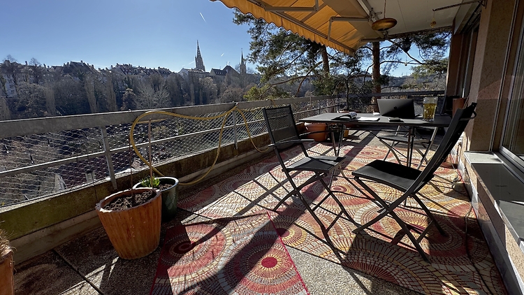 Helle, stilvoll möblierte 2.5-Zimmer-Wohnung am Aare-Südhang. Grosse Sonnenterrasse mit Blick auf Berner Altstadt und Aare. 7 min. -> Bärengraben, 15 min. -> Zytglogge, ruhige Lage am Diaconis-Park.
