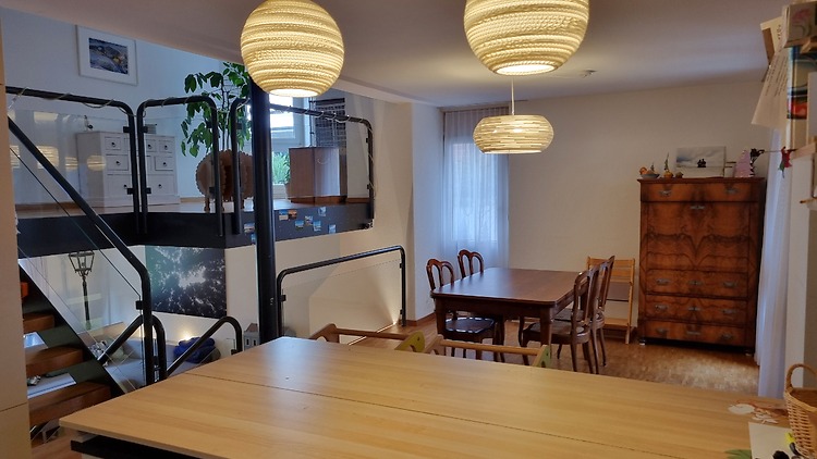 Ruhig gelegene grosszügige Maisonette-Wohnung mit Garten direkt an der Werdinsel. Drei Schlafzimmer, grosses Wohnzimmer, offene Küche und Essbereich. 15 Minuten mit Fahrrad zum Hauptbahnhof Zürich.