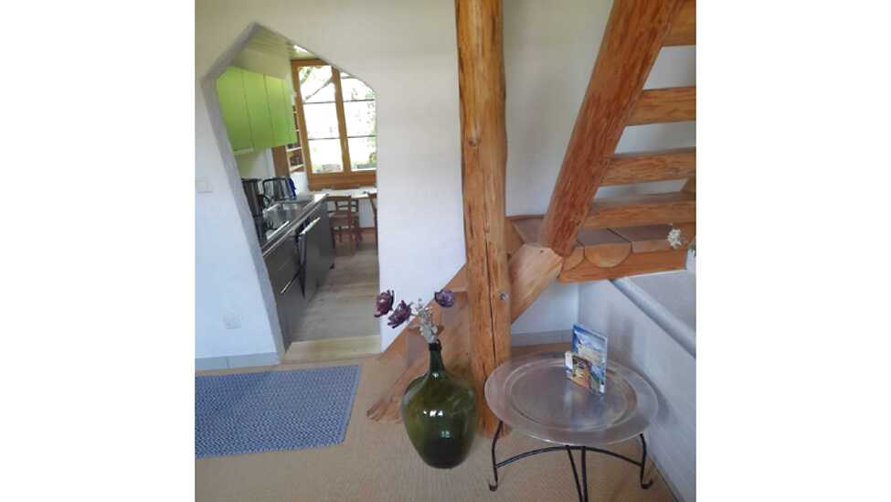 2,5- Zimmer-Wohnung mit Charme, zweistöckig, möbiliert und moderne ausgestattete Küche, keine Türen ausser beim Badezimmer. Vermieter wohnt nebenan.