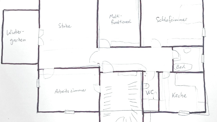 98m², im 1. Stock, 2 Schlafzimmer, 1 Büro (kann als Schlafzimmer benützt werden), in Altbau, in gutem Zustand