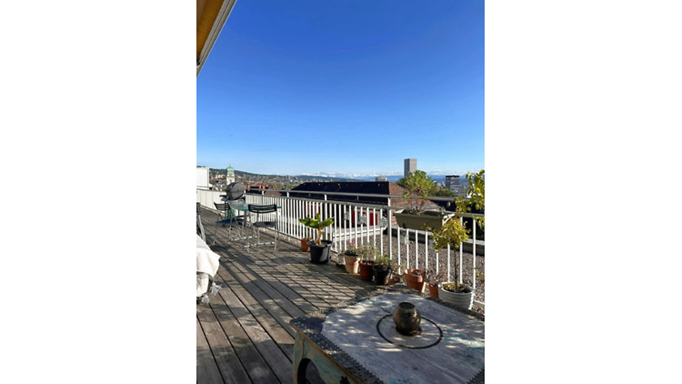 Helle, sonnige und ruhig gelegene, möblierte Wohnung mit grossem Balkon, Panoramasicht von Zürich bis zu den Alpen und einer voll ausgestatteten Küche. Ideal für 1-2 Personen im beliebten Zürich-Wipkingen.