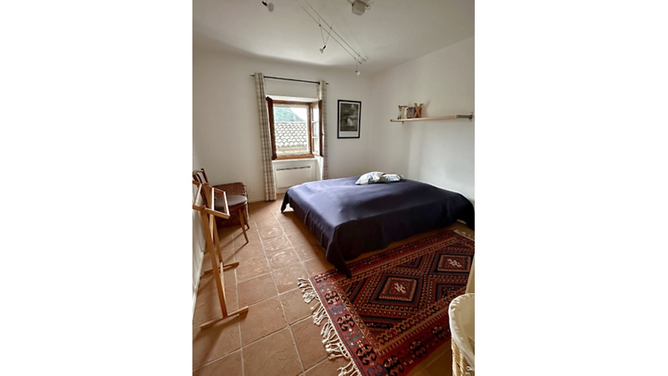 Diese geräumige Wohnung verfügt über 2 Schlafzimmer, eine Küche, ein Wohnzimmer und ein Bad mit Dusche (Umluft Cheminée, Natur-Steinboden).