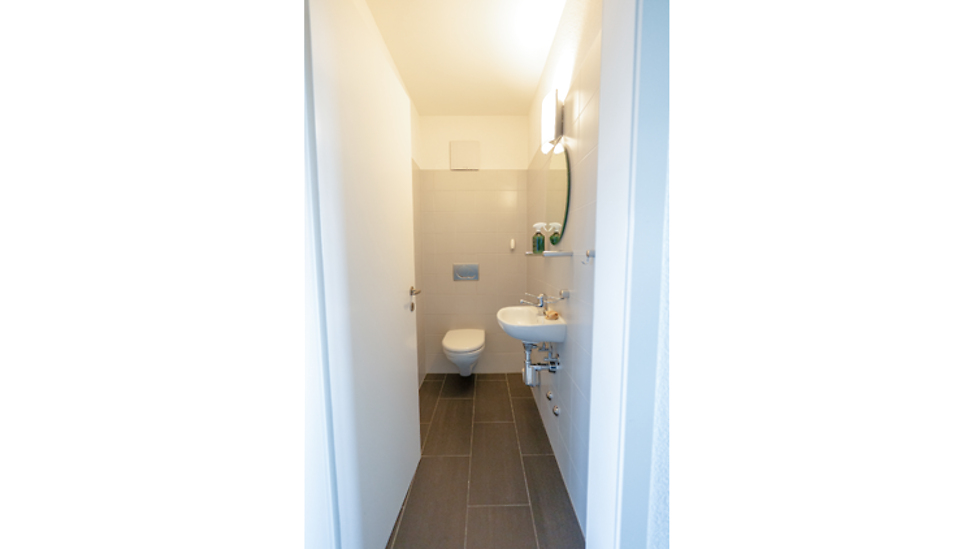 1 Badezimmer mit 2x Lavabo, WC, Dusche in Badewanne mit Glaswand, 1 sep. WC