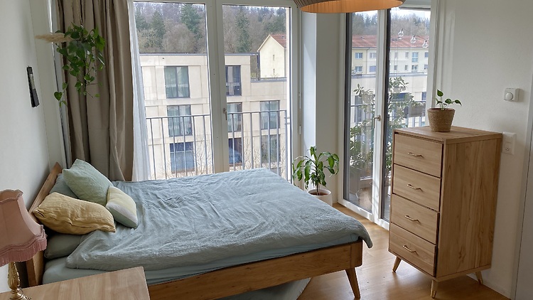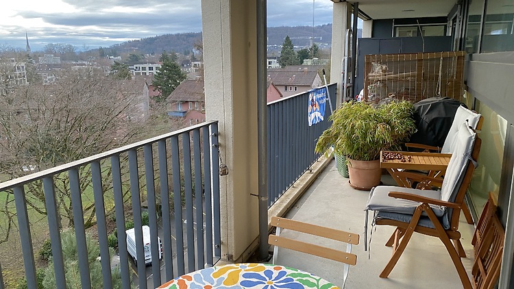 Sehr schöne, helle Wohnung mit Glasfronten & 2 Loggias, 2 WCs, Dusche, Bad. 5 Min. vom Käferbergwald in ruhiger, familienfreundlicher, grüner Siedlung. Super ÖV-Anbindung. Div. Einkaufsmöglichkeiten.