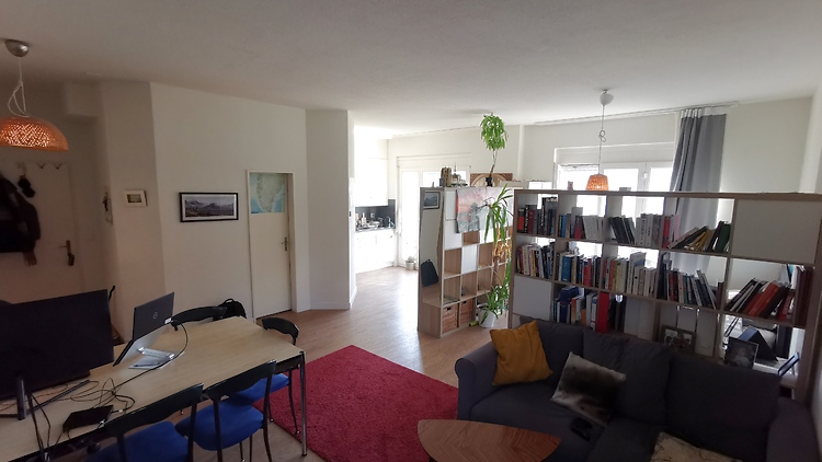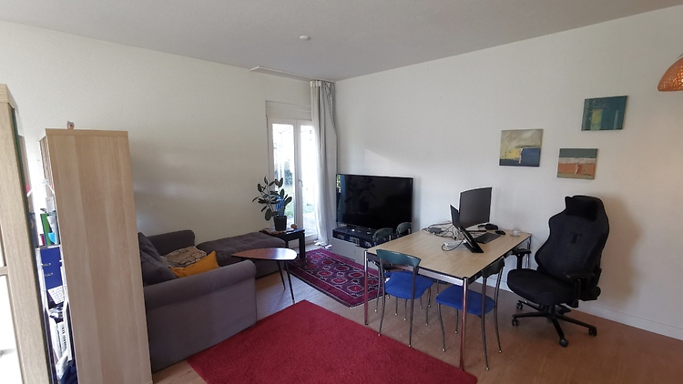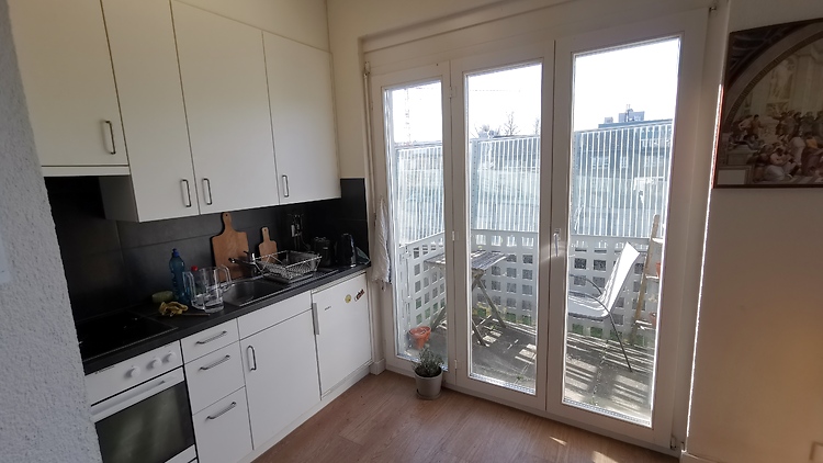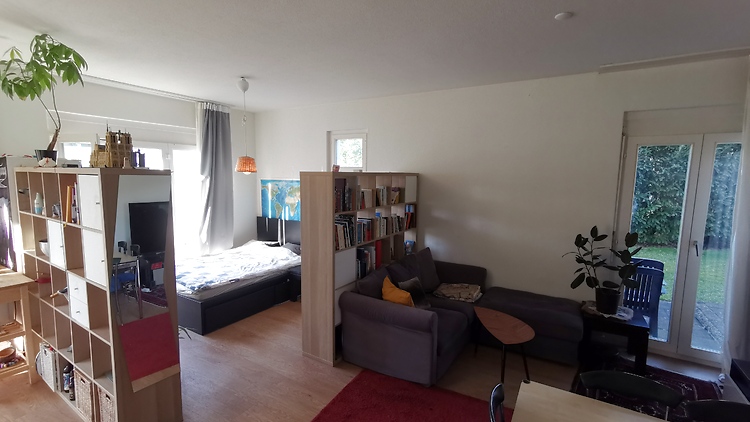 Gemütliche 41 m² 1-Zimmer-Wohnung in Zürich-Oerlikon: hell, hohe Decken, 2 Balkone + Gartensitzplatz, voll möbliert (140×200 Bett, Schreibtisch, 65" TV, PS4), AC, schnelles Wi-Fi, Dusche, alles inkl. 7 Min. zum Bahnhof.