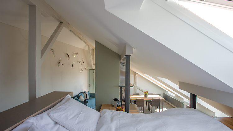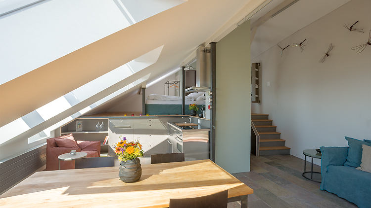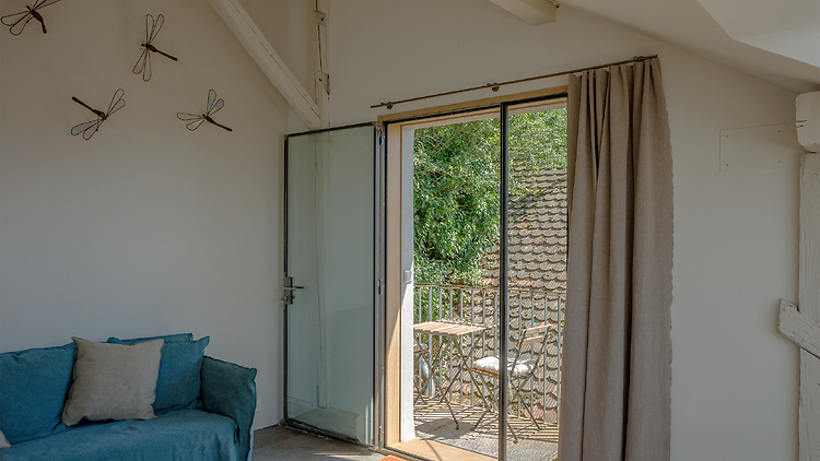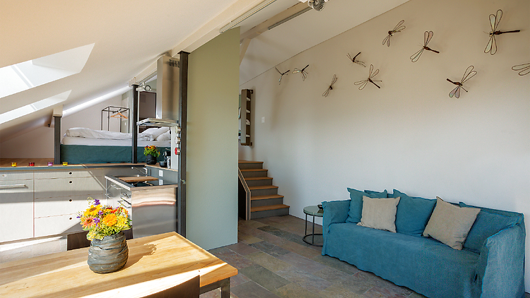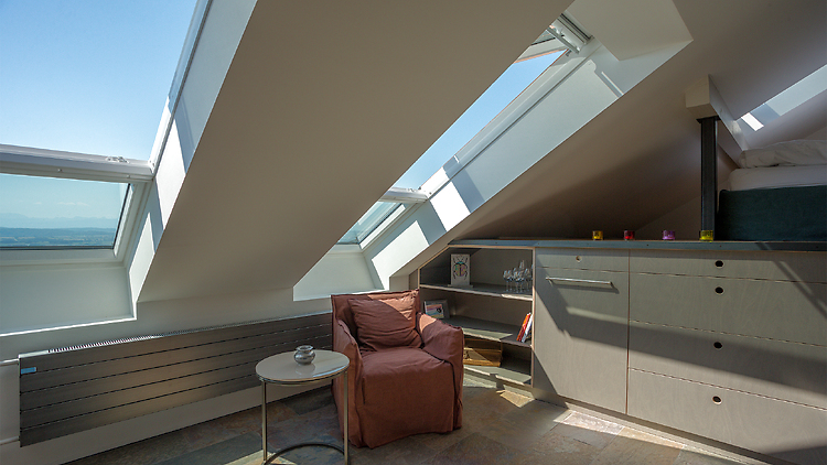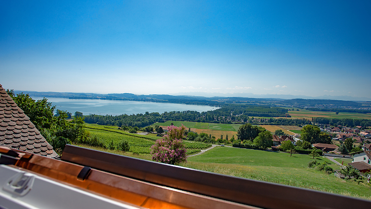 Eine Kulturlandschaft der besonderen Art - mit Atelier- und Galerienräumen, Beiz. Teil des originellen Ensembels ist ein stilvolles Studio, mit Blick auf die Weinreben, den Murtensee und die Alpen.