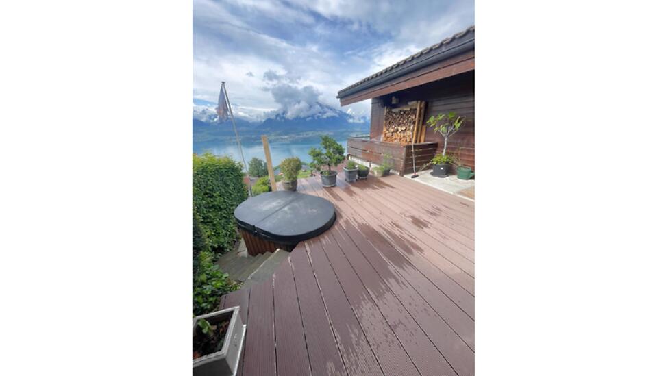 Sehr ruhig gelegenes Haus mit atemberaubendem Blick auf den Thunersee, Jungfrau Mönch und Eiger. Grosse, helle Räume mit allem Komfort, private Terrasse mit Hotpot und Wintergarten und Garten.