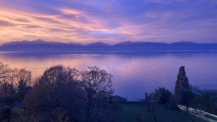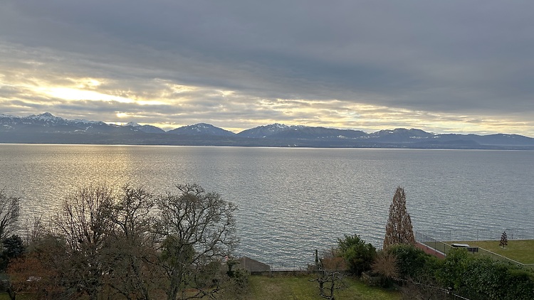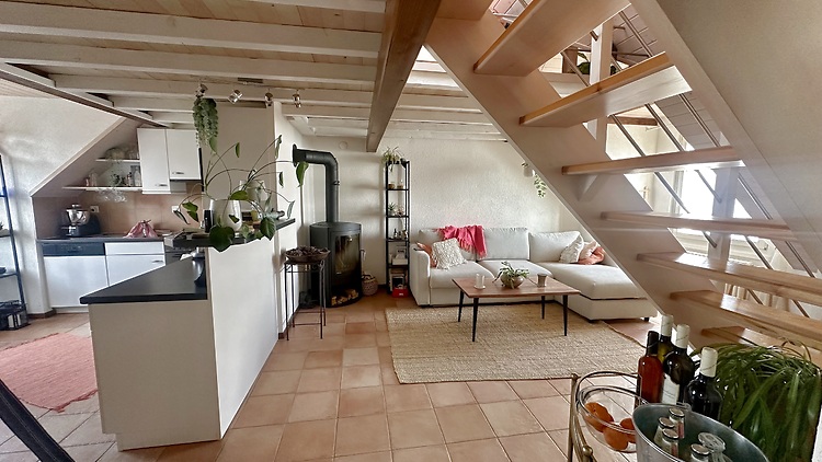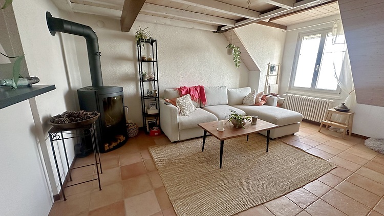 Charming furnished 2-room apartment (approx. 60m²), lake view, bright, exposed beams, wood-burning stove, mezzanine, equipped kitchen, parking. St-Prex, 2 minutes from the lake.