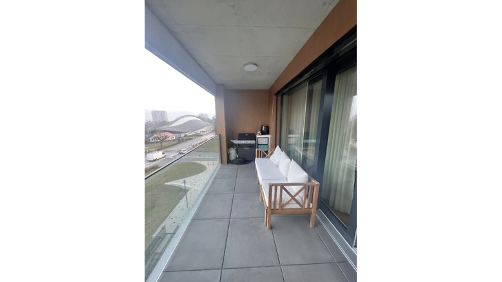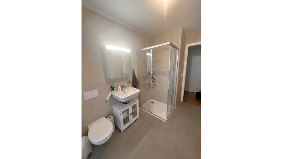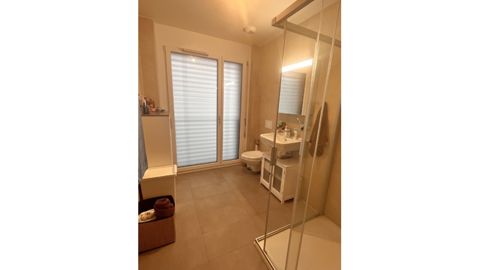 Appartement 2.5 pièces, 56 m², comprenant : 1 chambre, 1 salle de bain avec douche, 1 buanderie privée, 1 espace cuisine + salon, 1 balcon