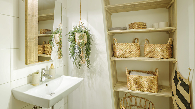 Beaucoup d'espace de rangement dans la salle de bain. 2 boîtes à chaussures sont disponibles dans le couloir.