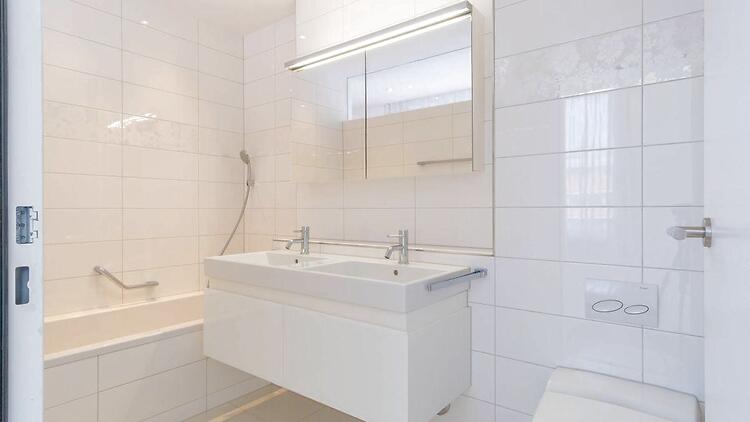 2 salles de bains modernes : 1 en suite avec baignoire et douche, WC, 1 avec douche et toilettes.