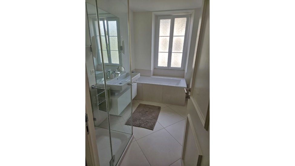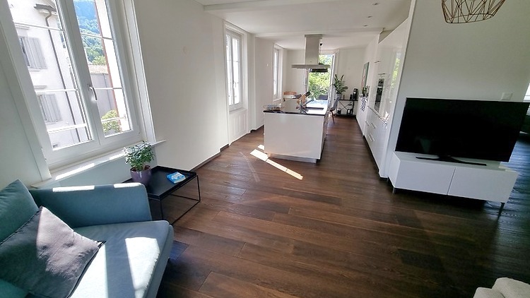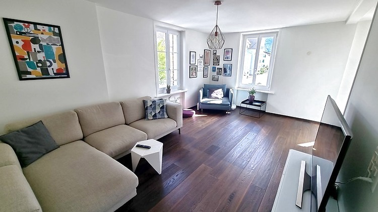 80m², au 1. étage, 2 chambres à coucher, 1 bureau (peut servir comme chambre à coucher), dans bâtiment ancien, récemment rénové, en bon état